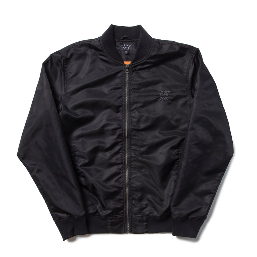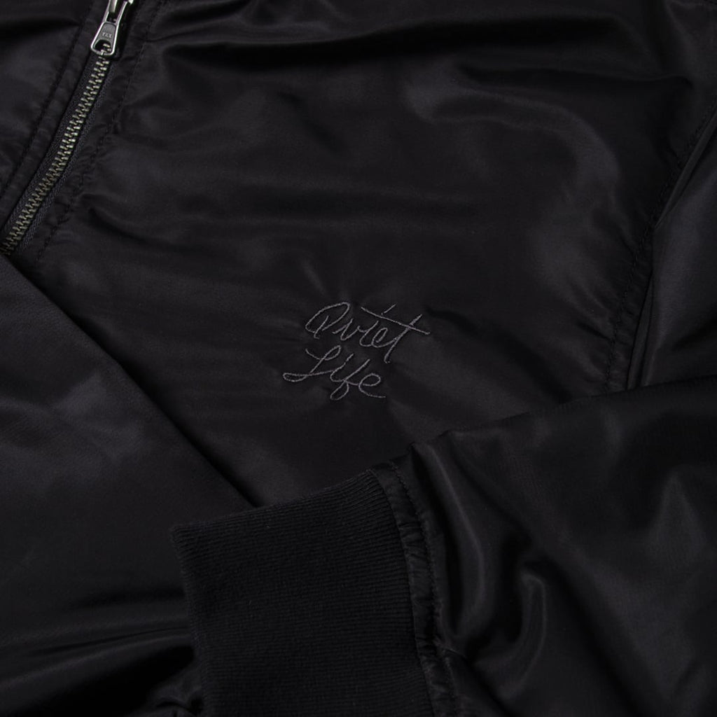 • Cotton twill • Heather jersey lining • Back applique • Front welt pockets • Exposed zipper • Tonal chest embroidery • Ribbed collar, cuff and waistband